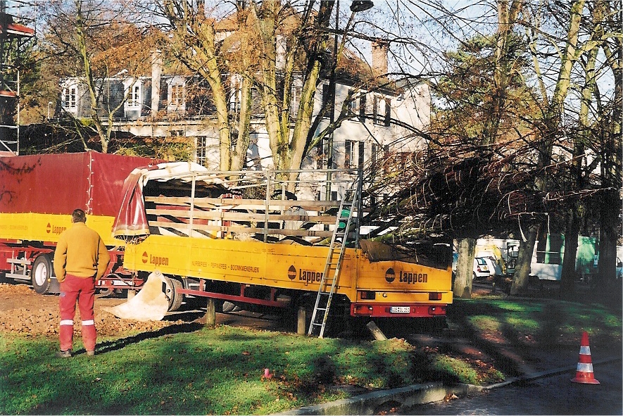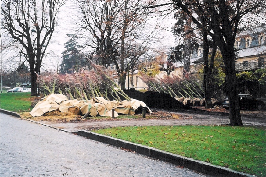 Abattage de 21 arbres Livraison des jeunes arbres par la pépinière Lappen stockage des arbres en attente de plantation Repérage des alignements