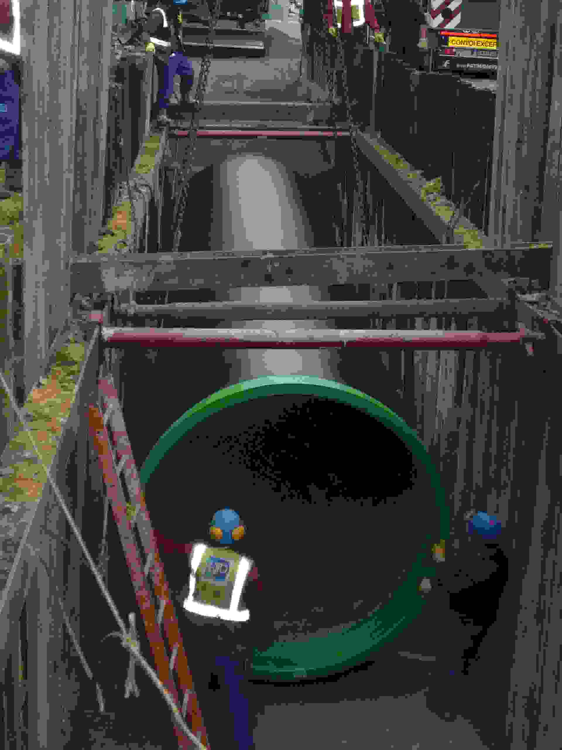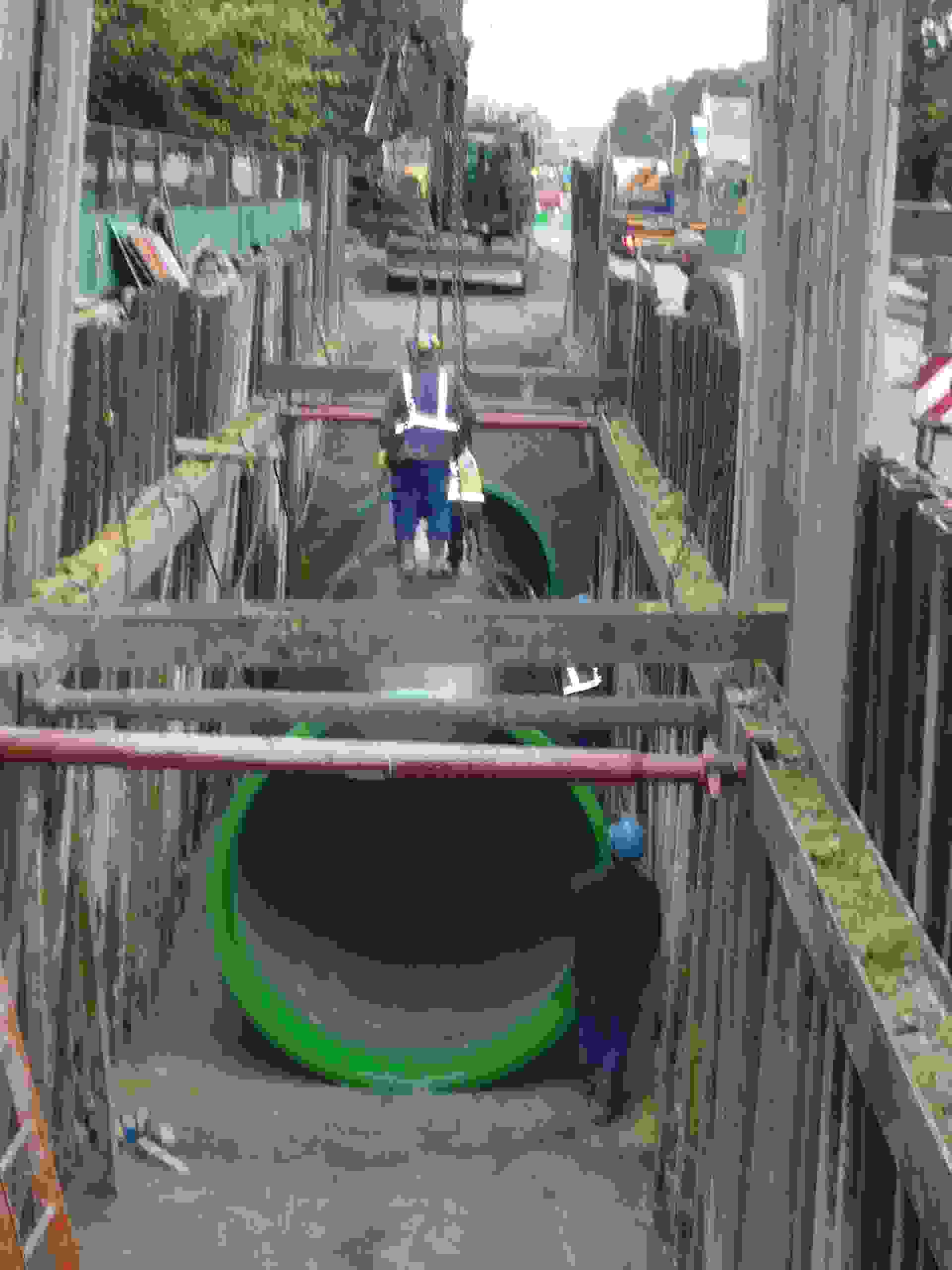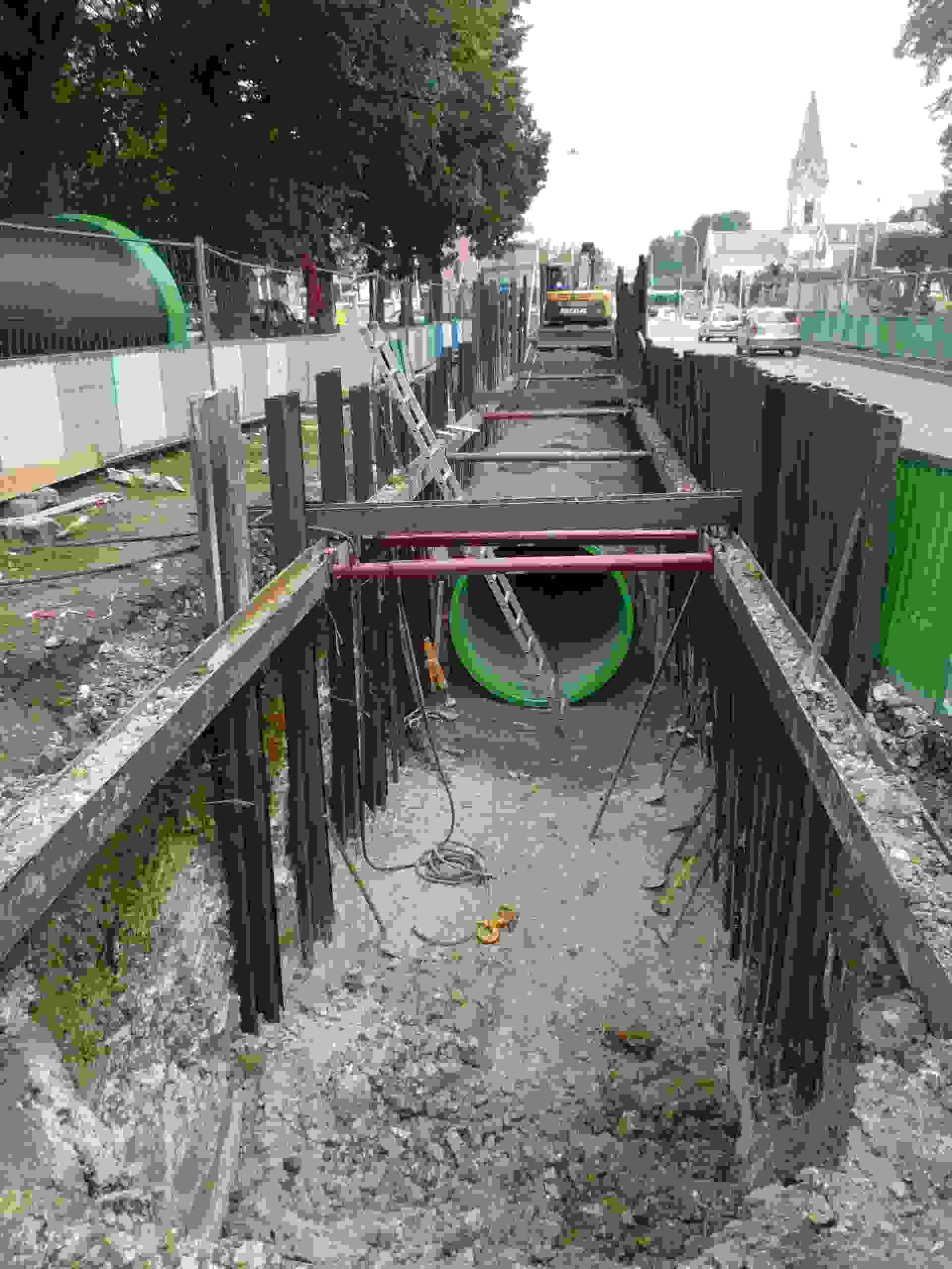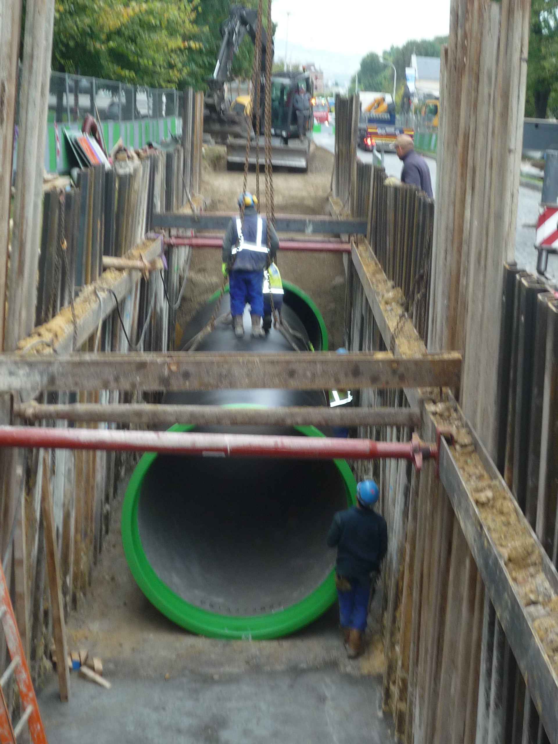 La rénovation du collecteur principal, qui se trouve dans la contre-allée ouest, a été effectué essentiellement par chemisage; les travaux en tranchée ouverte étant limités à la création du déversoir d'orage au carrefour Abbaye et au remplacement de 4 raccords de particuliers.