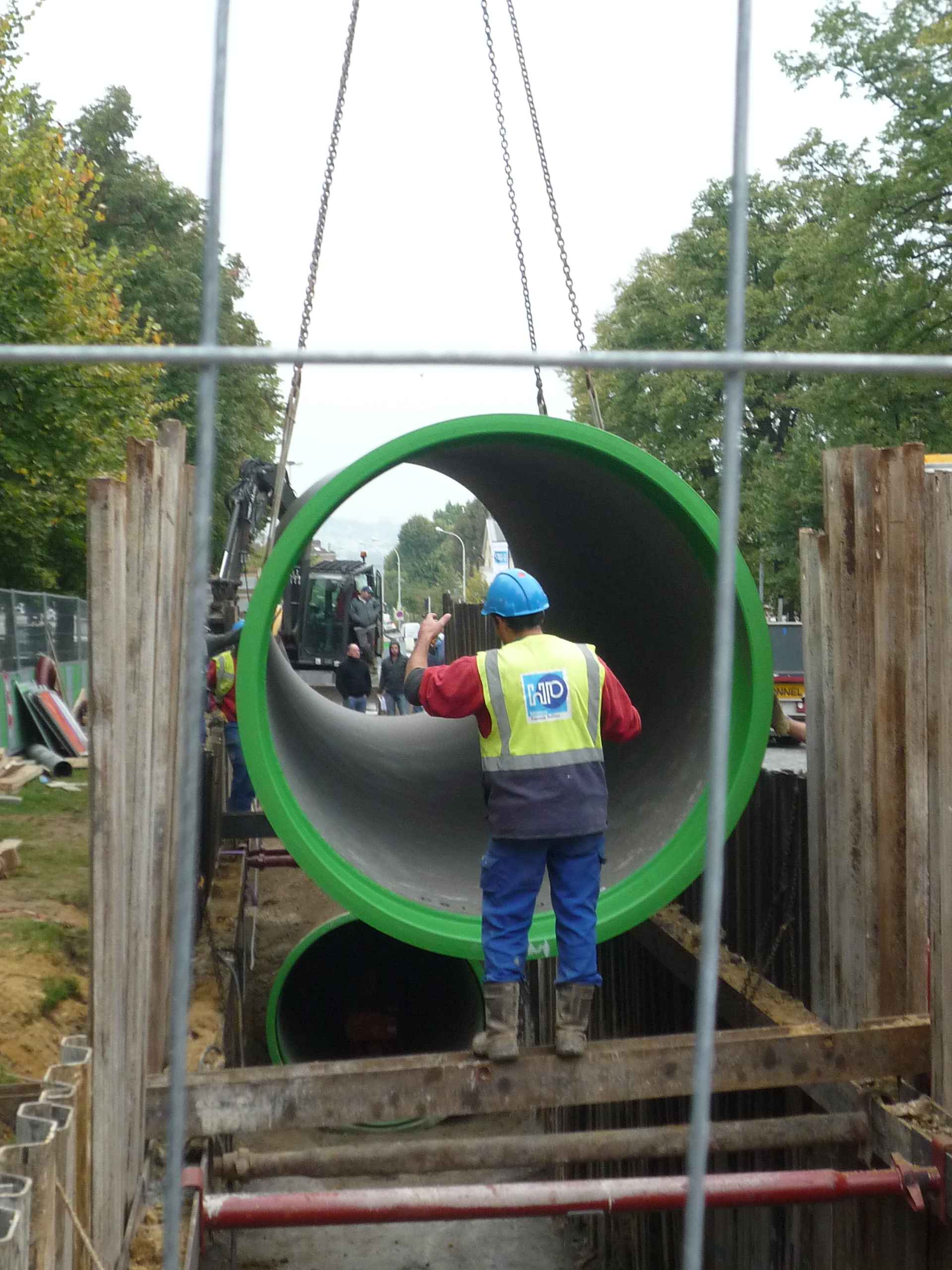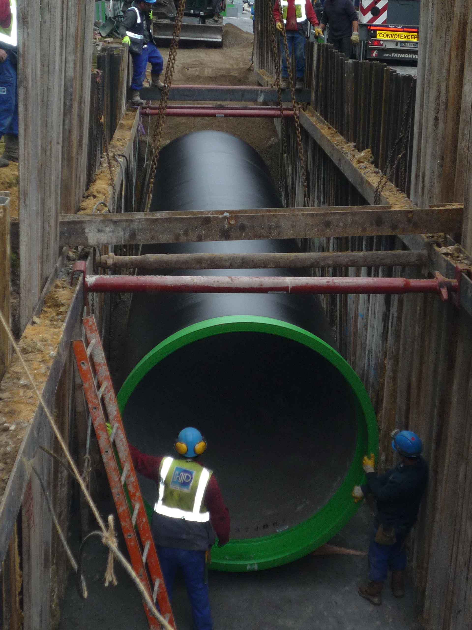 Pose des éléments du stockage tampon - octobre 2013Le collecteur principal de l'avenue, installé en 1974, est situé sous la contre-allée Ouest. Il collecte les eaux pluviales des deux contre-allées (par un réseau de collecteurs secondaires qui traversent l'avenue), les eaux domestiques et pluviales venant des collecteurs de l'avenue Marcellin Berthelot et de la rue de l'Abbaye et des propriétés riveraines coté Ouest.