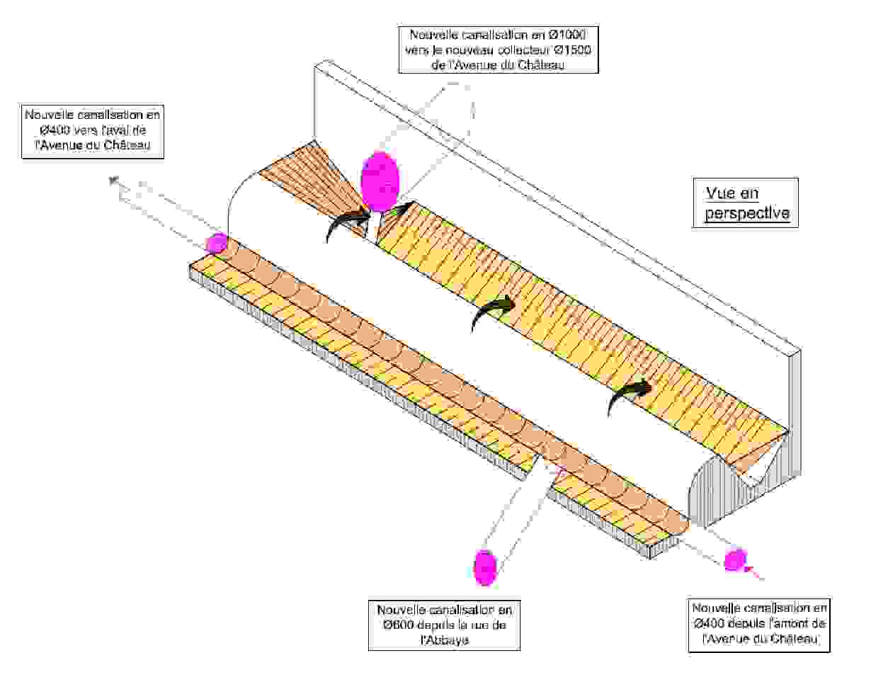 GPSO, la communauté d'agglomération responsable de ce réseau, a estimé nécessaire de faire certaines réparations sur ce collecteur et surtout de créer un stockage tampon, pour éviter l'engorgement des eaux pluviales à la jonction avec le collecteur de la route des Gardes, lors de très fortes pluies. GPSO a donc décidé de rénover ce collecteur par chemisage du collecteur existant et par la création d'un réseau de stockage tampon, constitué de deux tuyaux de 2 m de diamètre, de part et d'autre de la voie centrale sur la partie gazonnée (voir plan et coupe ci dessous). Les liaisons traversant la voie centrale ont été réalisées en tunnel sans ouverture de la chaussée centrale.A la sortie de la rue de l'Abbaye, dans la contre-allée, un déversoir d'orage a été implanté pour dévier l'excès d'eau, en cas d'orage, dans le réseau de stockage tampon: